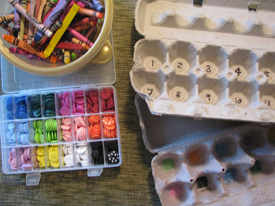 Il vous faudra deux boîtes d'oeufs, un crayon noir, des crayons de couleurs et de petits objets à classer comme des perles ou des ponpons; nous avons utilisé des boutons multicolores.